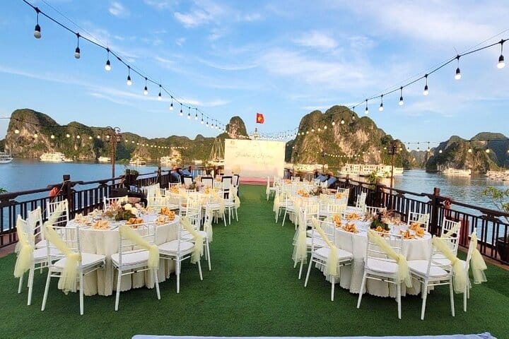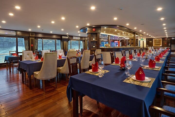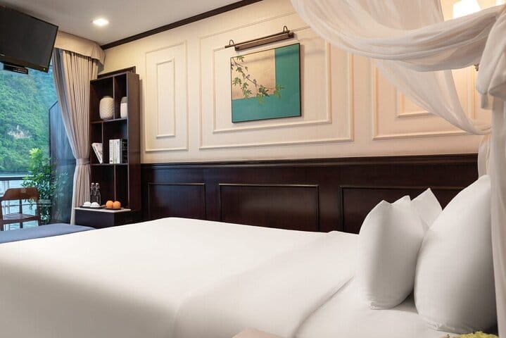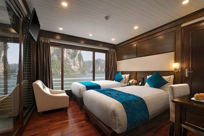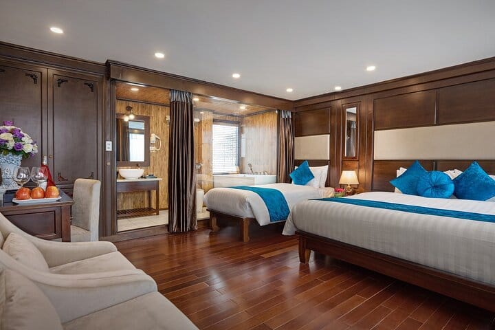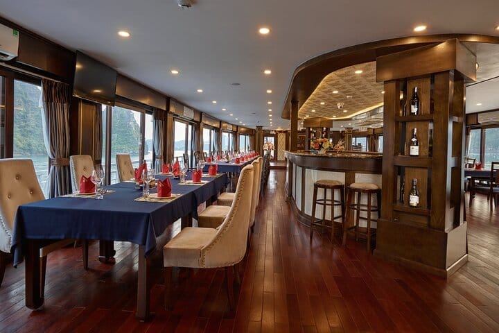 Welcome to a luxury 5-star cruise experience in Halong Bay, where contemporary elegance meets exceptional comfort and safety. Featuring well-designed itineraries, attentive service, refined décor, and gourmet cuisine, this journey offers a truly unique and unforgettable stay. With 22 private cabins equipped with balconies and Jacuzzi tubs, along with premium facilities such as a panoramic restaurant, outdoor bar, seasonal swimming pool, gym, spa & massage, and children’s playground, every detail is thoughtfully crafted to make your Halong Bay discovery both exclusive and memorable.